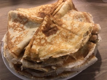 Farine, œufs, lait, beurre, sucre et parfumées au Grand Marnier.