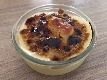 Crème brulée composée de crème fraîche liquide, d'œufs, sucre, vanille, sucre vergeoise utilisé pour brûler le dessus de la crème