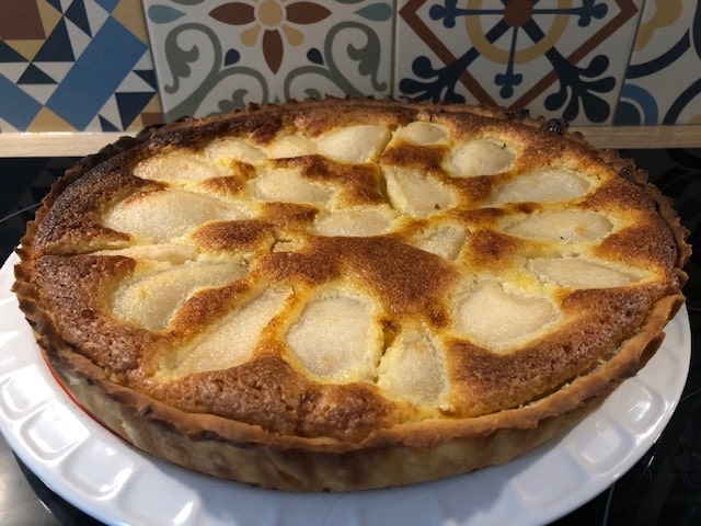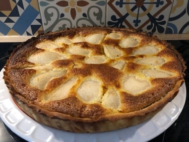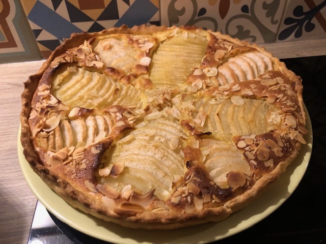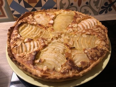 Pâte brisée sucrée maison, crème d'amande avec une touche de rhum, poires fraîches, amandes effilées.