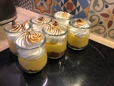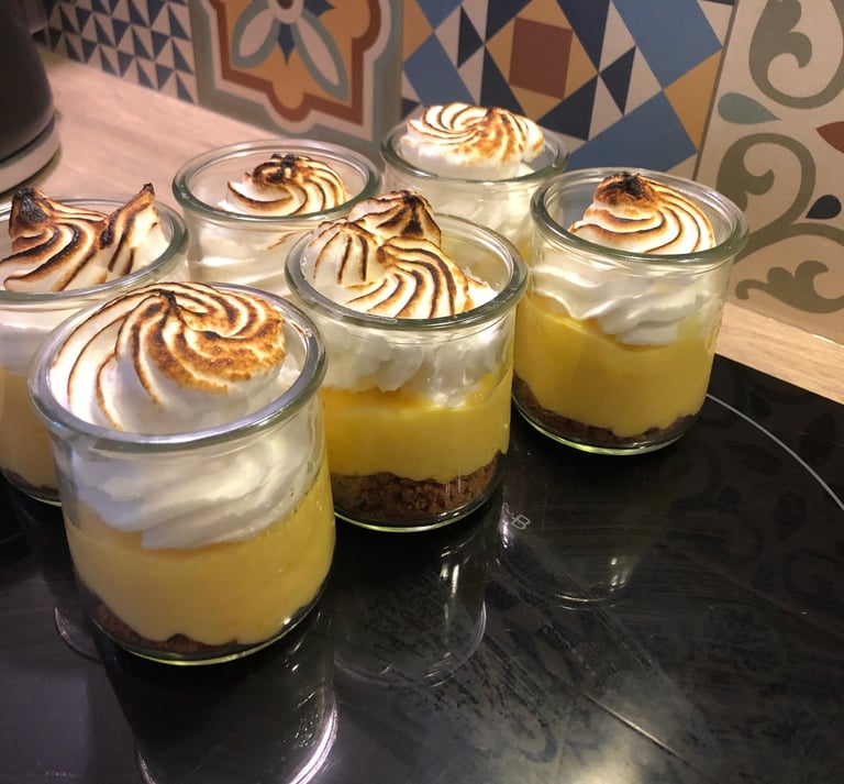 Verrine composée sur un lit de spéculoos émietté, crème Lemon Curd et recouvert d'une meringue italienne.