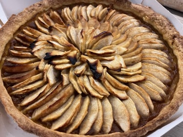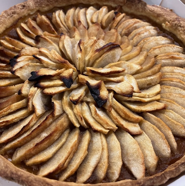 Pâte brisée sucrée maison, un lit de compote, fines tranches de pommes caramélisées.