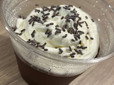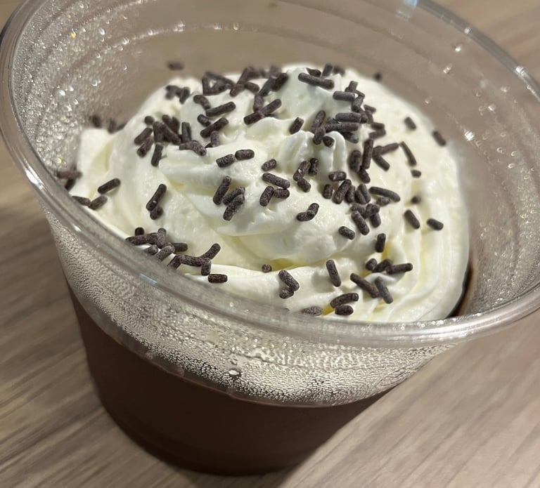 Verrine composée d'une crème au chocolat maison surmontée d'une chantilly montée au mascarpone.