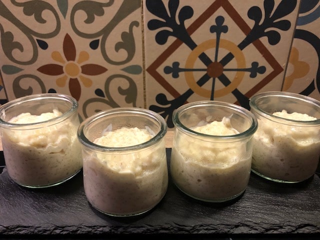 Riz rond cuit dans du lait, de la crème fraîche liquide, un peu de sucre, parfumé à la gousse de vanille de Madagascar.