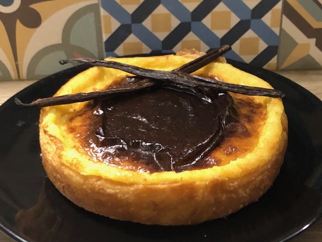 Crème composée d'un lait infusé aux zestes de citron et orange, bâton de cannelle, d'œufs, sucre, farine, sucre vergeoise utilisé pour brûler le dessus de la crème